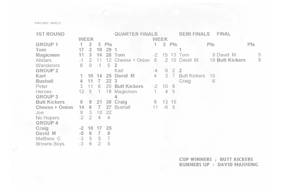 Four of the current managers remained from the previous season, and they were joined by five new additions, taking the league up to nine teams. Four of the five were Ross Peggs, Adam Pritchard, Stuart Wigby and David Hadingham. The fifth, and the eventual 1994/95 champion was Lawrence Baynes, who again if memory serves me correct, only joined the league hours before the pre-planned auction. The video also shows excited onlookers, and future sfp managers Paul Cooper and Craig Hunting, plus Ben Sprake. Nick has also just been stung by a wasp on the cheek.