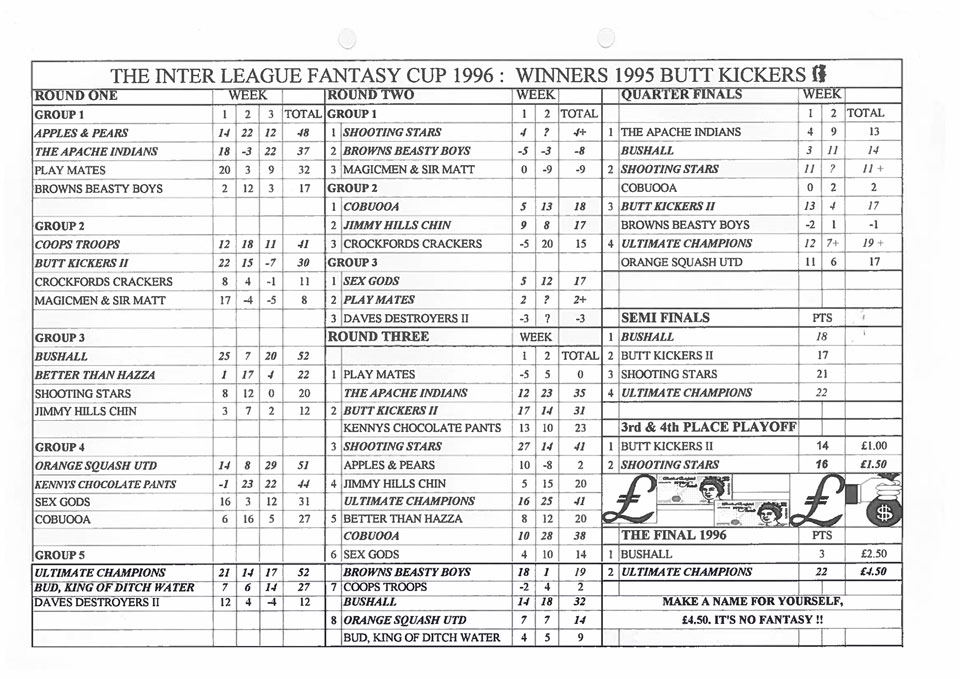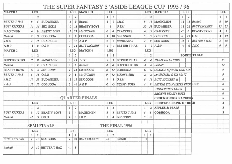 In 1995 the league grew again with the addition of 3 more managers. Peter Crockford, Regan Peggs and Andrew Prior joined the previous season's nine managers for auction three, hosted inside the Bungay Boathouse Scout H.Q. on an evening after school.