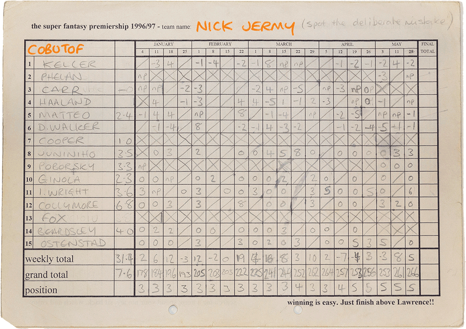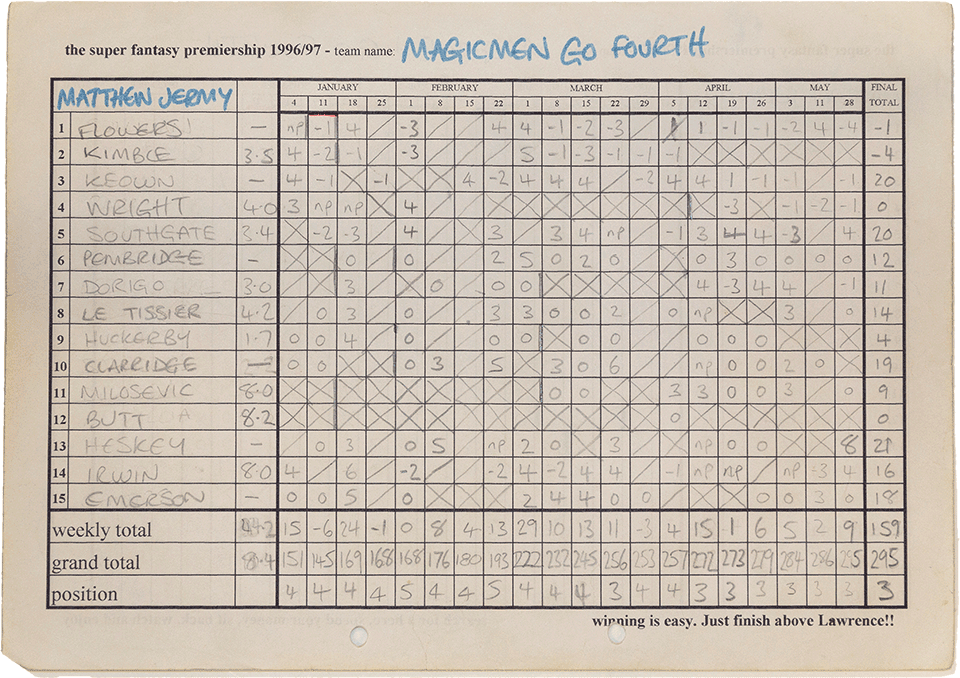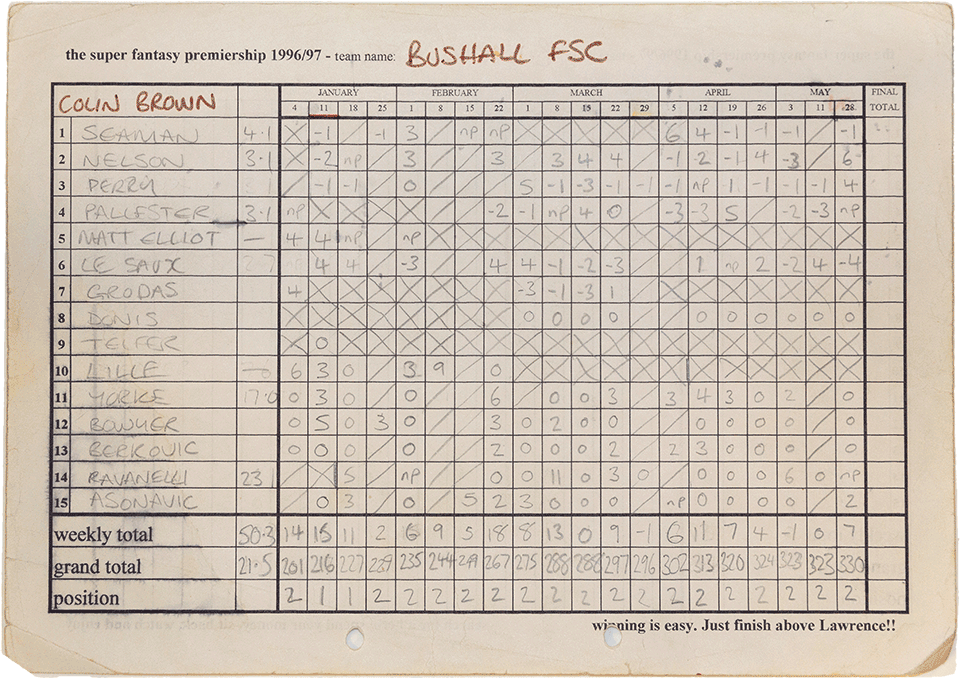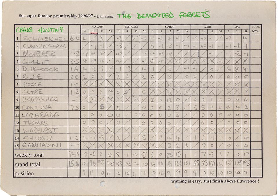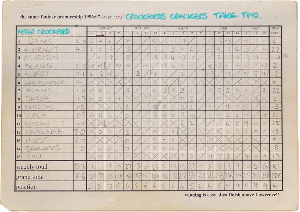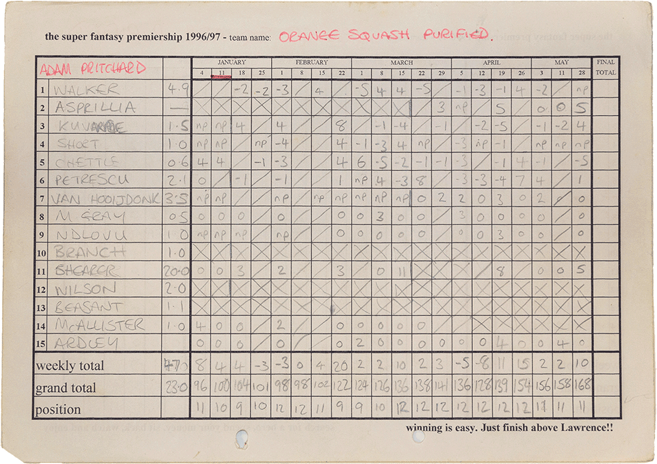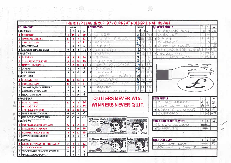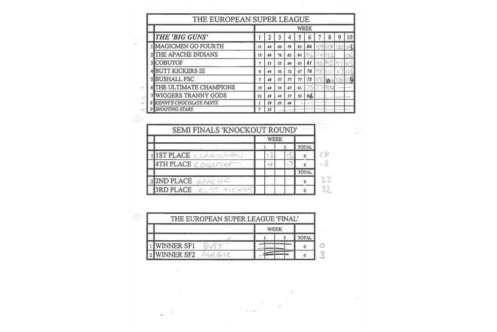 In the 1996/97 season the league was supported by a weekly (when possible) newsletter produced by Ross Peggs. Fifteen Men & A Fantasy would turn up on a Friday night at Scouts updating all managers on the latest league positions, cup information and transfer activity. Ross would also go the extra mile with interviews, stats and facts. To view these newsletters, click on the link above to open a PDF.