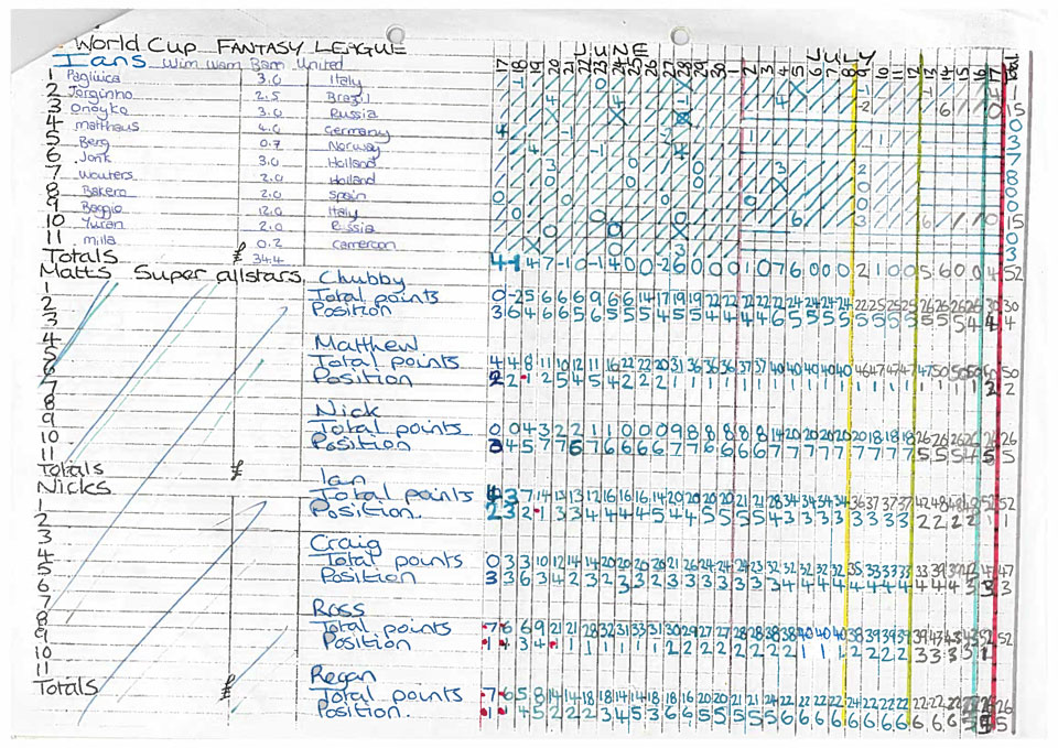 On the following day, Saturday 26th February 1994 the season began. With quite simply 4 points for a clean sheet, minus points for goals conceded, 2 points for an assist and only 3 for a goal, the first weekend of scoring finished with Matt’s Magicmen on top of the pile with 10 points. Brown’s Boys would go on to lead for most the season.
